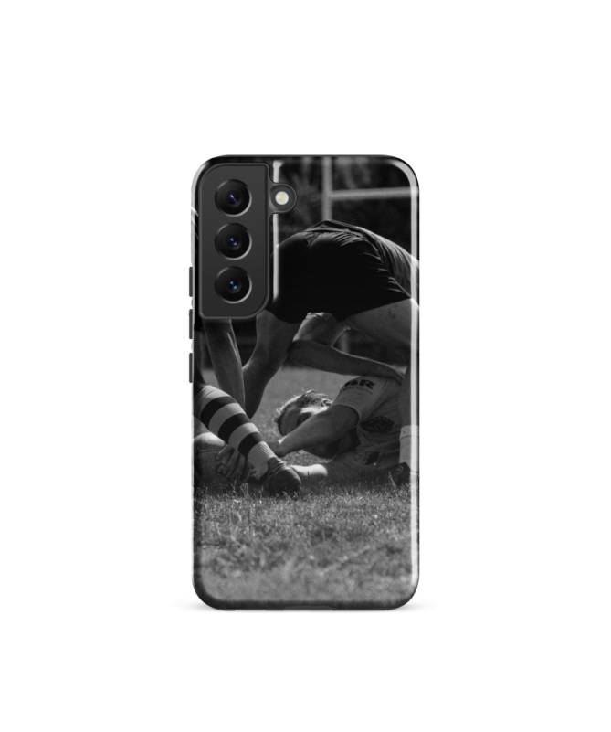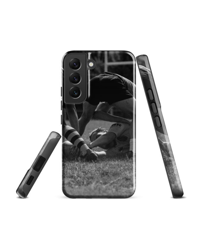Découvrez l'intensité du rugby avec la coque Samsung "RUCKBIS" Les Francophones, capturant l'énergie d'un ruck en noir et blanc pour les passionnés du sport.