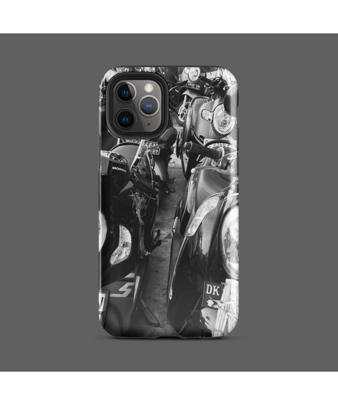 Découvrez le charme urbain de Bali avec notre Coque iPhone FREDB SCOOT, capturant la symphonie visuelle des scooters alignés dans un parking, une photo signée FRED BALISTER.