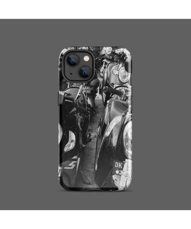 Le choix délibéré du noir et blanc confère une dimension intemporelle à cette coque, accentuant les jeux d'ombre et de lumière pour une esthétique puissante. Elle évoque le sentiment de liberté et d'aventure que l'on ressent lors de l'exploration de Bali à scooter.