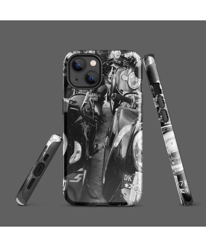 Découvrez le charme urbain de Bali avec notre Coque iPhone FREDB SCOOT, capturant la symphonie visuelle des scooters alignés dans un parking, une photo signée FRED BALISTER.