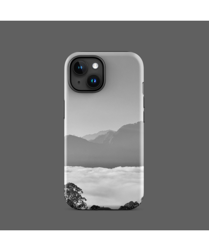 Explorez les cieux balinais avec la coque iPhone FREDB NUAGE, une photo en noir et blanc époustouflante des montagnes de Bali émergeant majestueusement au-dessus des nuages.