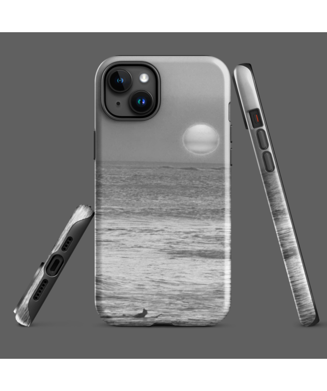 Coque iPhone FREDB PARADIS : Découvrez le paradis balinais à travers cette superbe photo en noir et blanc, avec un coucher de soleil sur l'océan et un surfeur en silhouette.