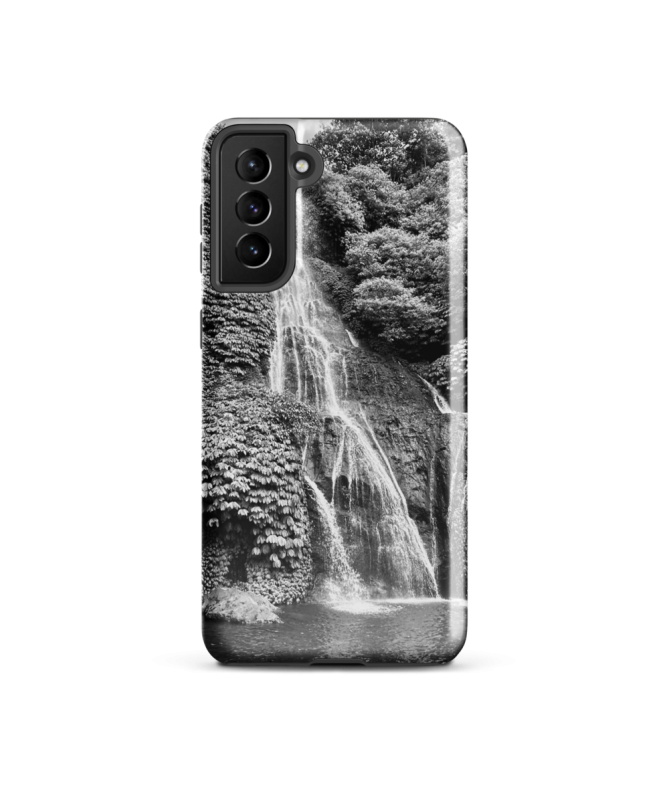 Plongez dans la nature sauvage avec la coque Samsung FREDB CHUTE. Une photo en noir et blanc capturant la majesté des chutes d'eau au cœur de la jungle balinaise.