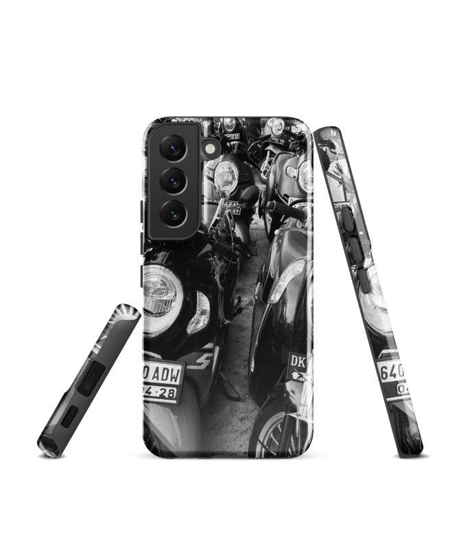 Découvrez le charme urbain de Bali avec notre Coque Samsung FREDB SCOOT, capturant la symphonie visuelle des scooters alignés dans un parking, une photo signée FRED BALISTER.