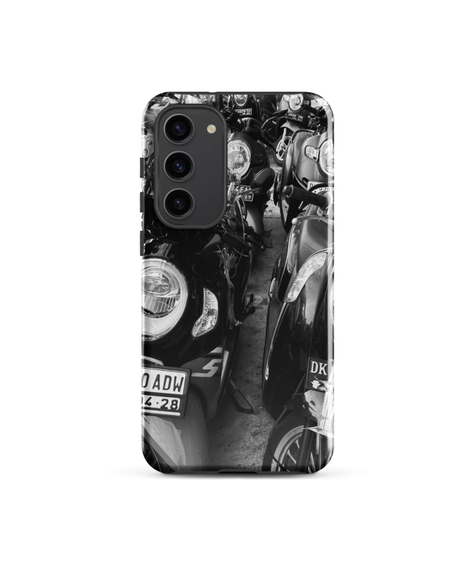 Découvrez le charme urbain de Bali avec notre Coque Samsung FREDB SCOOT, capturant la symphonie visuelle des scooters alignés dans un parking, une photo signée FRED BALISTER.