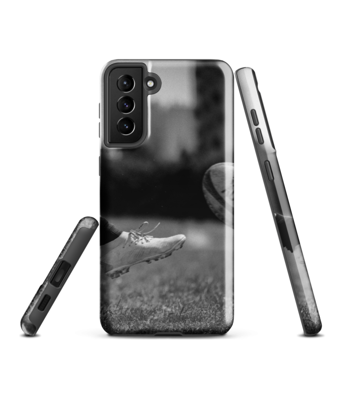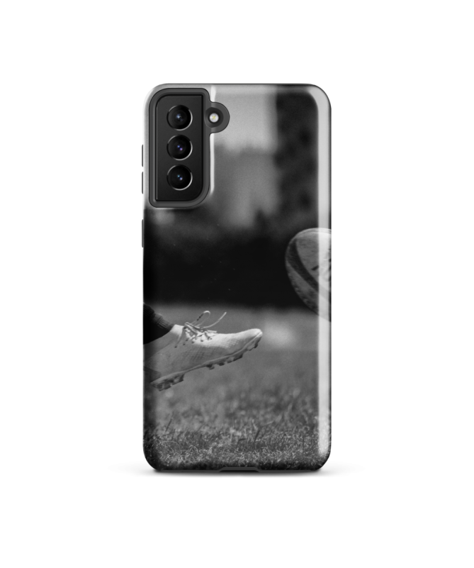 Plongez dans l'intensité du rugby avec la coque Samsung CRAMBALL Les Francophones, illustrant un coup de pied puissant dans un ballon de rugby, mettant en avant les détails des crampons du joueur en action.