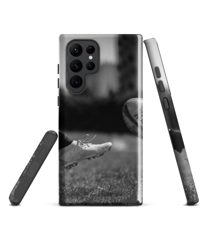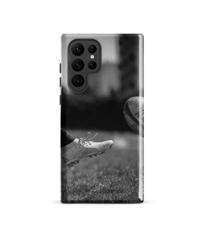 La coque Samsung BOTTE Les Francophones capturent l'intensité du rugby avec une photo en noir et blanc mise en scène sur un joueur exécutant un coup de pied de pénalité, ajoutant une touche sportive à votre téléphone.