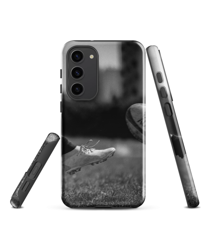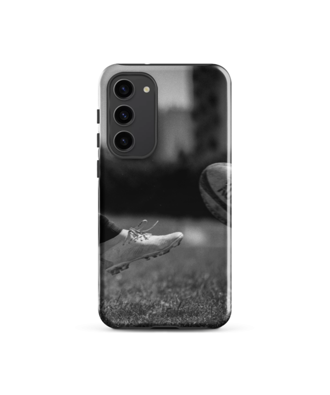Plongez dans l'intensité du rugby avec la coque Samsung CRAMBALL Les Francophones, illustrant un coup de pied puissant dans un ballon de rugby, mettant en avant les détails des crampons du joueur en action.