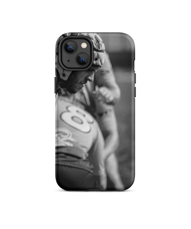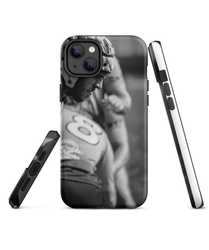 Dive into the heart of rough action with the iPhone RUCK Les Francophones. This shell, part of our special Rugby World Cup in France, presents a striking black and white photo of a ruck in formation. A third central line is supported by its teammates, capturing the intensity and comradeship of the game.