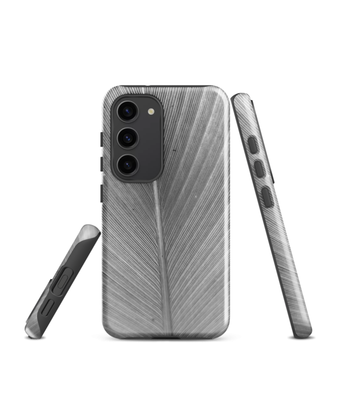 Explore the striking aesthetic of nature with the Samsung FREDB PALME case, featuring a close-up black and white photo of a palm leaf. Natural elegance at your fingertips.