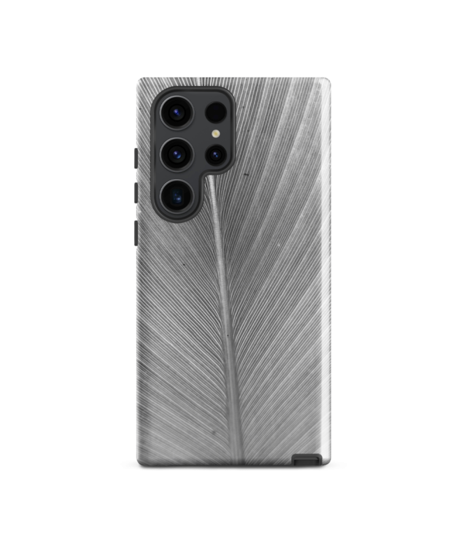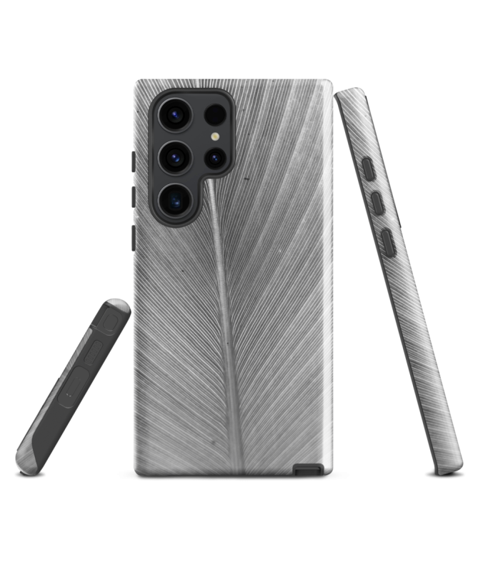 Explore the striking aesthetic of nature with the Samsung FREDB PALME case, featuring a close-up black and white photo of a palm leaf. Natural elegance at your fingertips.