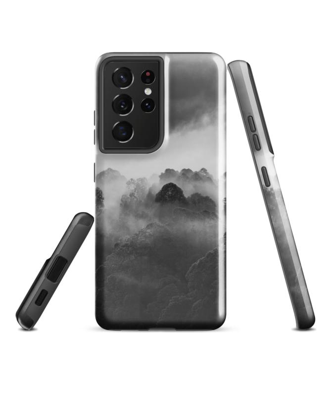 Explore the mysterious beauty of the Balinese forest with the Samsung FREDB POINTE case, capturing in black and white the enigmatic silhouette of a tree emerging from the...