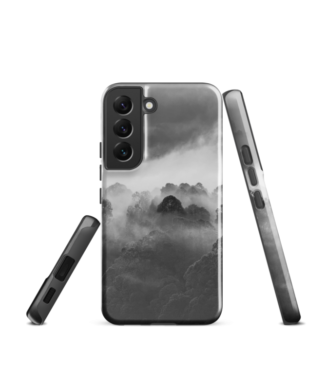 Explore the mysterious beauty of the Balinese forest with the Samsung FREDB POINTE case, capturing in black and white the enigmatic silhouette of a tree emerging from the...