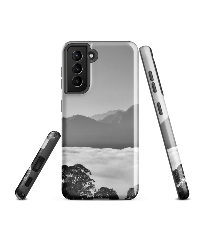 Explore the Balinese skies with the Samsung FREDB NUAGE case, a stunning black and white photo of the Bali mountains emerging majestically above the clouds.