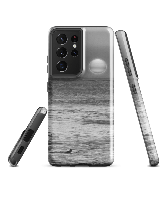 Samsung FREDB PARADIS case: Discover the Balinese paradise through this superb black and white photo, with a sunset over the ocean and a surfer in silhouette.