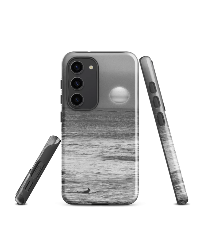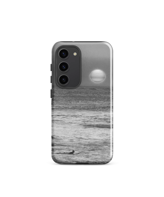 Samsung FREDB PARADIS case: Discover the Balinese paradise through this superb black and white photo, with a sunset over the ocean and a surfer in silhouette.