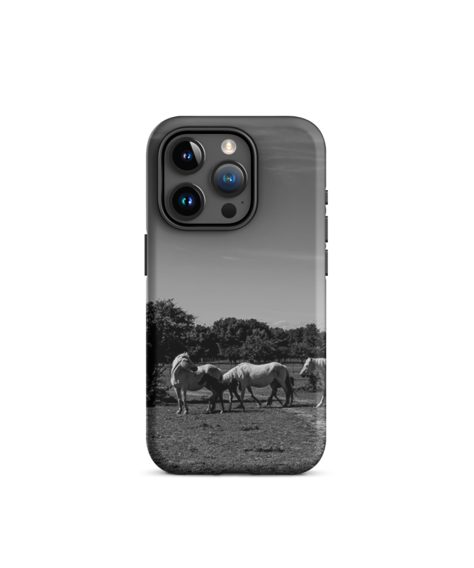 Esplora l'eleganza senza tempo con i nostri "iPhone Black and White Horses Les Francophones". Ispirato da una foto accattivante di cavalli in bianco e nero in un paesaggio di Camargue, questo guscio aggiunge un tocco di bellezza selvaggia al vostro iPhone.
