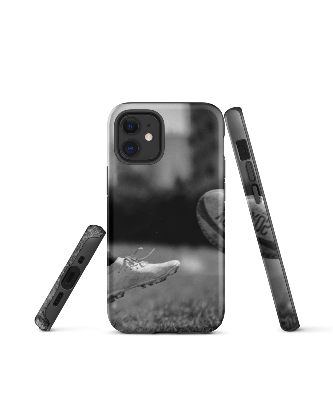 Immergiti nell'intensità del rugby con lo scafo di iPhone CRAMBALL Les Francophones, illustrando un calcio potente in una palla rugby, evidenziando i dettagli dei crampi del giocatore in...