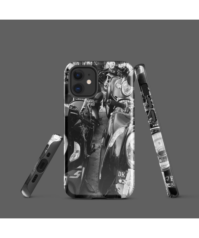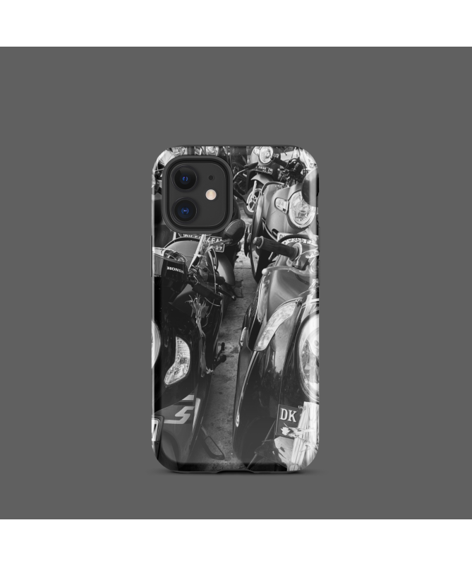 Scopri il fascino urbano di Bali con la nostra custodia per iPhone FREDB SCOOT, catturando la sinfonia visiva degli scooter in fila in un parcheggio, una foto di FRED...