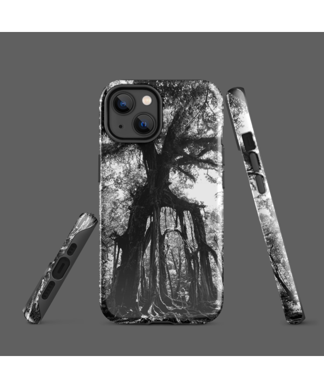 Custodia per iPhone FREDB TREE: un inno alla maestosità della natura balinese, catturata in bianco e nero per un'esperienza visiva unica.
