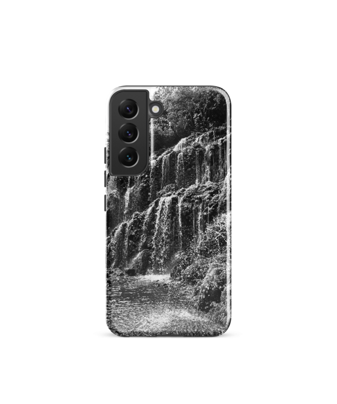 Immergiti nella natura selvaggia con la custodia Samsung FREDB CHUTE. Una foto in bianco e nero che cattura la maestosità delle cascate nel cuore della giungla balinese.