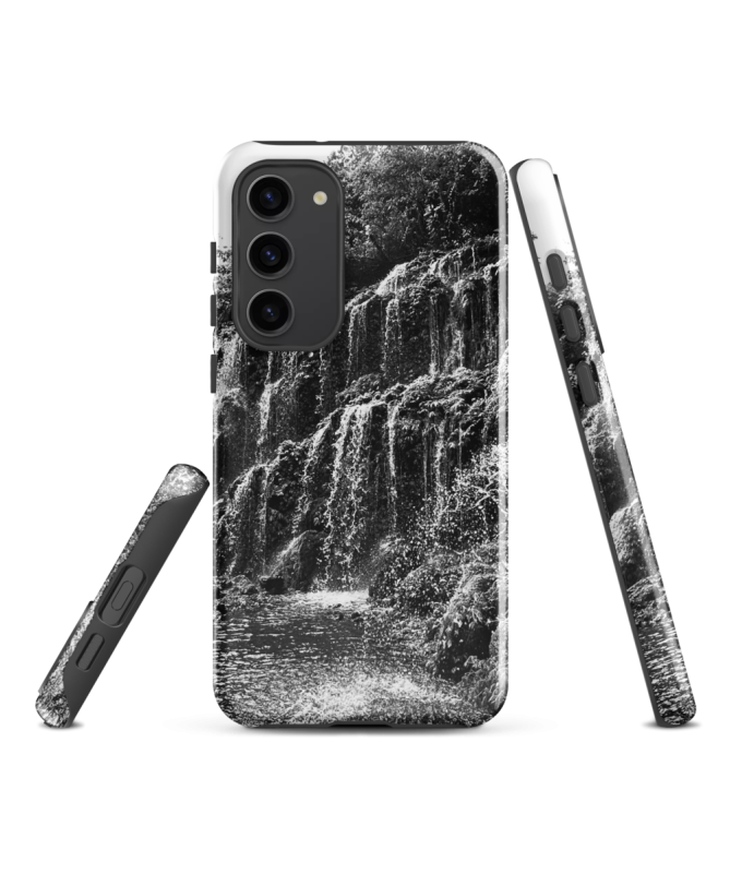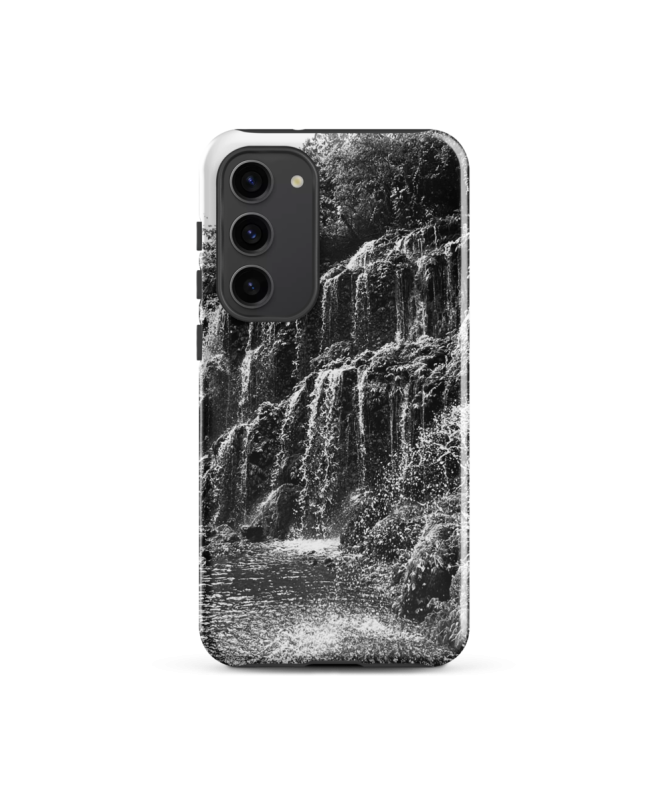 Immergiti nella natura selvaggia con la custodia Samsung FREDB CHUTE. Una foto in bianco e nero che cattura la maestosità delle cascate nel cuore della giungla balinese.
