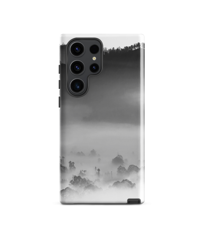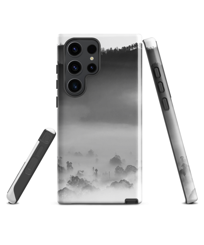 Esplora la misteriosa bellezza della foresta balinese con la custodia Samsung FREDB POINTE, catturando in bianco e nero l'enigmatica sagoma di un albero che emerge dalla nebbia.